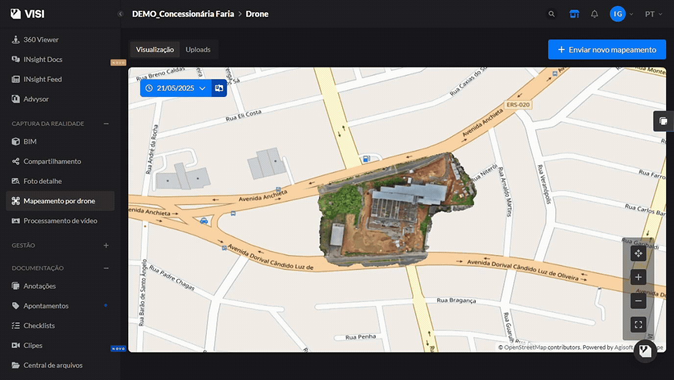 Na funcionalidade de Mapeamento por drone, a partir das fotos de alta resolução do drone, a plataforma combina automaticamente as imagens para gerar um ortomosaico navegável e preciso, permitindo visualizar o canteiro por inteiro em um mapa interativo.